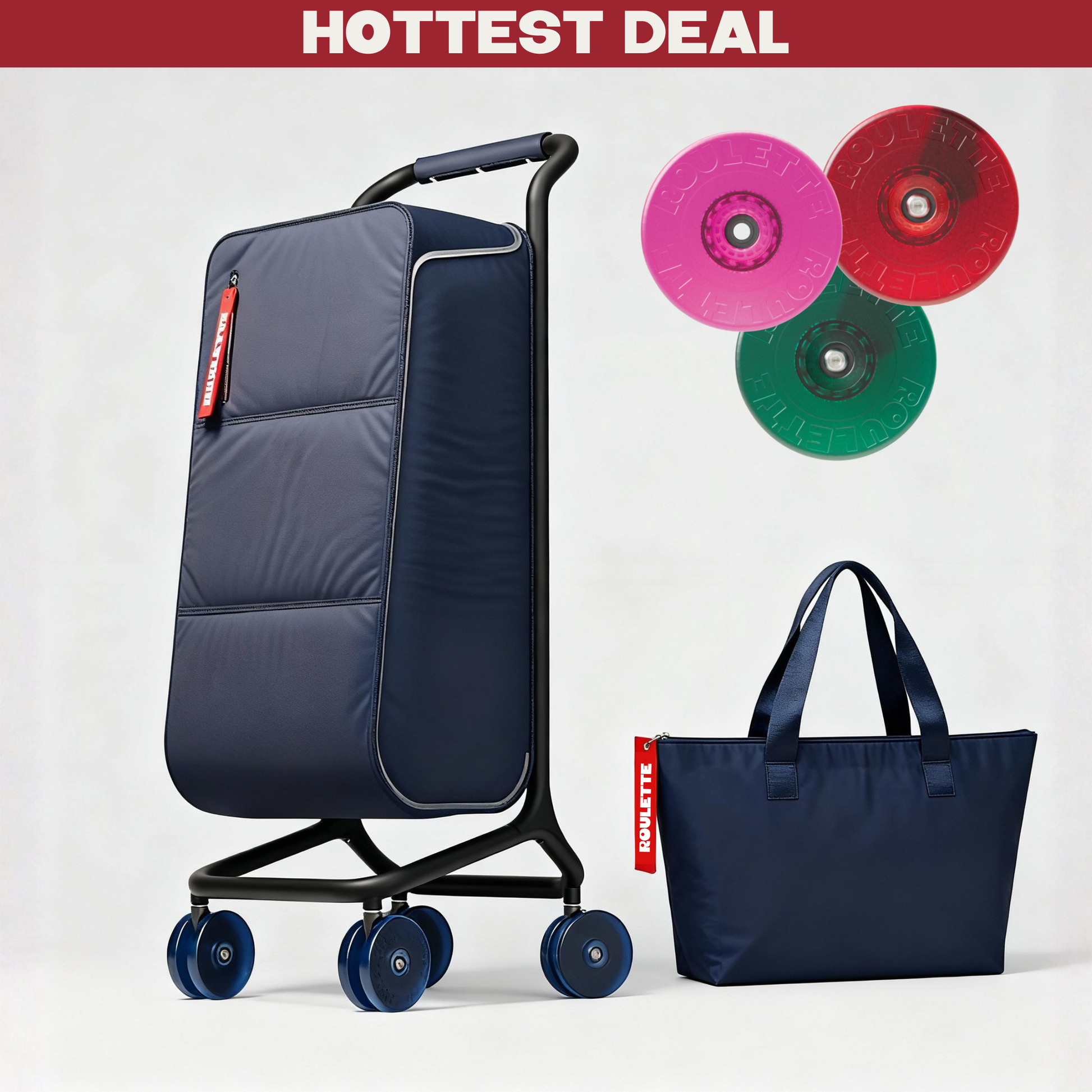 Roll into the season with the Winter Sale Blue Bundle, our best seasonal deal on the iconic blue Roulette shopping trolley. This limited-edition set includes the Manhattan Blue Roulette, a matching tote bag (Freezer Pack), and vibrant interchangeable wheels for a bold, functional upgrade.